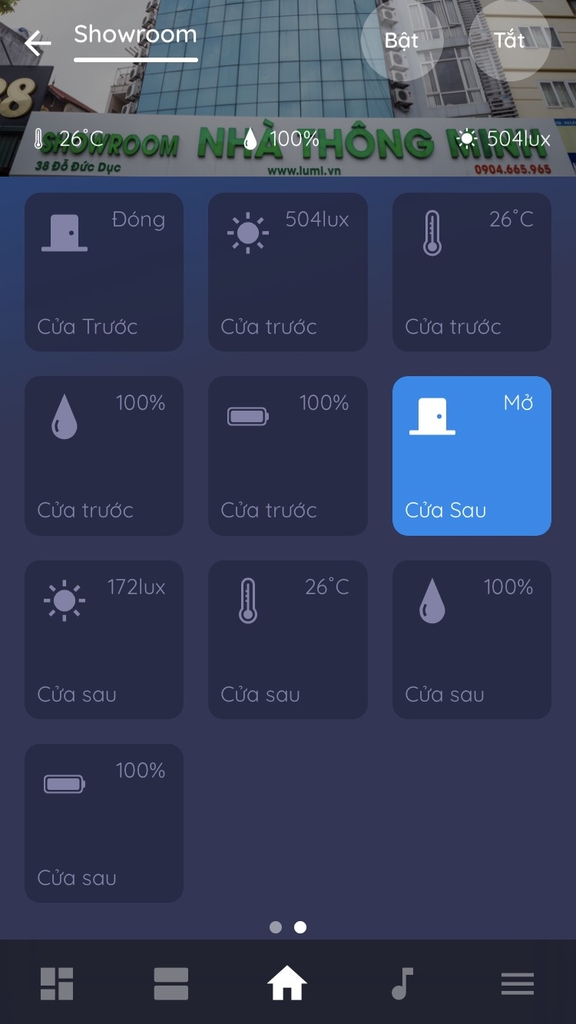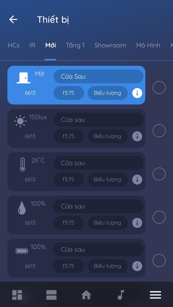 Trong giao diện phòng người dùng chuyển sang tab hiển thị cảm biến để xem trạng thái của cảm biến.